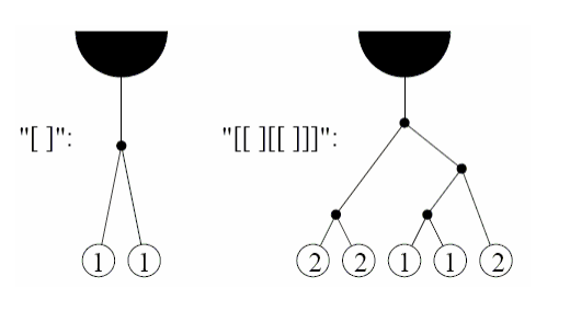 덩굴은 두개의 덩굴로 나눠질 수 있는데 덩굴이 끊어지지 않기 위해서는 나눠진 두 덩굴은 같은 수의 원숭이들이 매달려 있어야 한다. 덩굴의 나눠지는 지점을 "[]"로 정의 내리면 덩굴의 구조를 꺾쇠괄호로 표시할 수 있다. 또한 덩굴의 깊이는 25를 넘지 않는다.